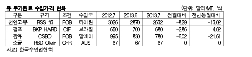 표, 그래프: < 유‧무기원료 수입가격 변화 > <화학저널 2013/09/03> |