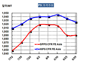 HIPS 가격은 8월28일 CFR China 톤당 1925달러로 10달러 하락했다.