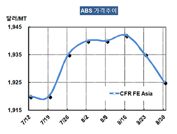 ABS 가격은 8월28일 CFR China 톤당 1925달러로 10달러 하락했다.