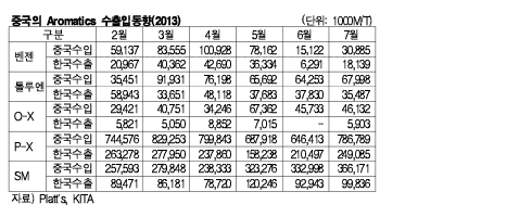 표, 그래프: < 중국의 Aromatics 수출입동향(2013) > <화학저널 2013/09/04> |