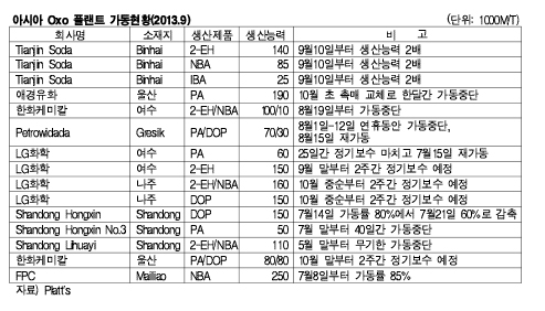 표, 그래프: < 아시아 Oxo 플랜트 가동현황(2013.9) > <화학저널 2013/09/05> |