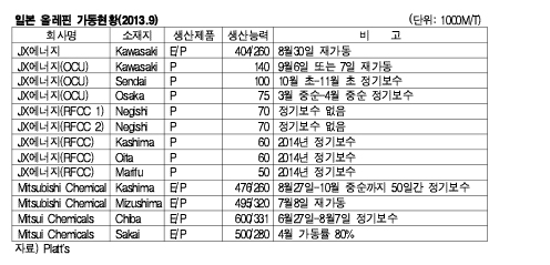 표, 그래프: < 일본 올레핀 가동현황(2013.9) > <화학저널 2013/09/06> |