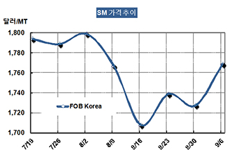 SM 가격은 9월6일 FOB Korea 톤당 1769달러로 42달러 급등했다.