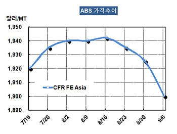 ABS 가격은 9월4일 CFR China 톤당 1900달러로 25달러 급락했다.