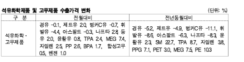 표, 그래프: < 석유화학제품 및 고무제품 수출가격 변화 > <화학저널 2013/09/11> |