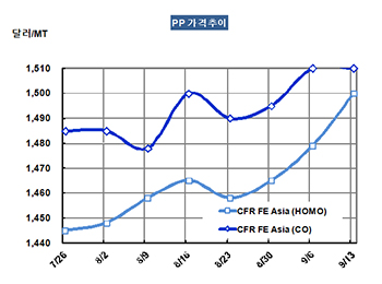 PP 가격은 9월11일 CFR FE Asia 톤당 1500달러로 21달러 급등했다.