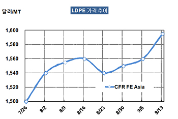LDPE 가격은 9월11일 CFR FE Asia 톤당 1595달러로 35달러 폭등했다.