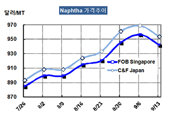 나프타 가격은 9월13일 CFR Japan 톤당 954달러로 15달러 하락했다.