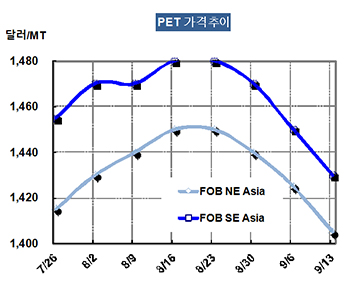PET 가격은 9월11일 FOB NE Asia 톤당 1405달러로 20달러 하락했다.