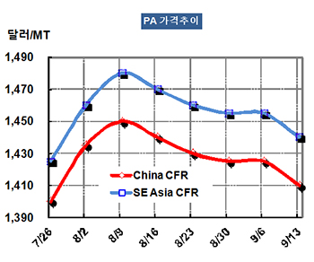 PA 가격은 9월12일 CFR China 톤당 1410달러로 15달러 하락했다.
