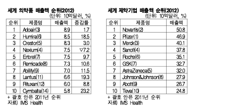 표, 그래프: < 세계 의약품 매출액 순위(2012) >< 세계 제약기업 매출액 순위(2012) > <화학저널 2013/09/24> |