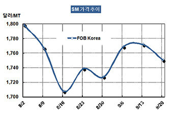 SM 가격은 9월20일 FOB Korea 톤당 1750달러로 22달러 하락했다.