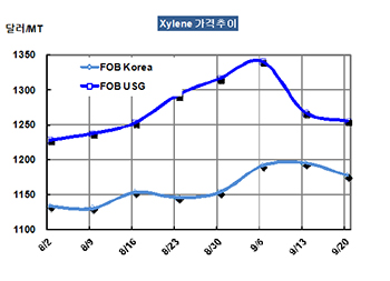 표, 그래프: < Xylene 가격추이 > <화학저널 2013/09/26> |