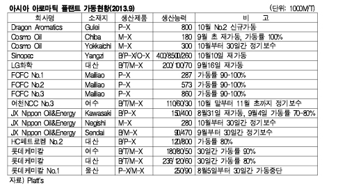 표, 그래프: < 아시아 아로마틱 플랜트 가동현황(2013.9) > <화학저널 2013/09/27> |