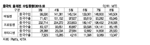 표, 그래프: < 중국의 올레핀 수입동향(2013.9) > <화학저널 2013/09/30> |