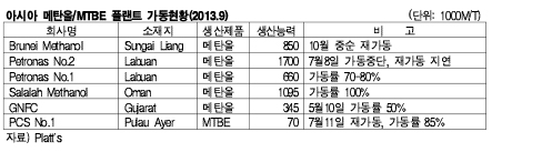 표, 그래프: < 아시아 메탄올/MTBE 플랜트 가동현황(2013.9) > <화학저널 2013/10/07> |
