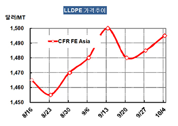 LLDPE 가격은 10월2일 CFR FE Asia 톤당 1495달러로 10달러 상승했다.