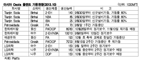 표, 그래프: < 아시아 Oxols 플랜트 가동현황(2013.10) > <화학저널 2013/10/10> |