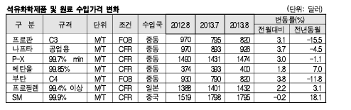 표, 그래프: < 석유화학제품 및 원료 수입가격 변화 > <화학저널 2013/10/14> |