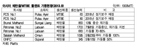 표, 그래프: < 아시아 메탄올/MTBE 플랜트 가동현황(2013.9) > <화학저널 2013/10/15> |