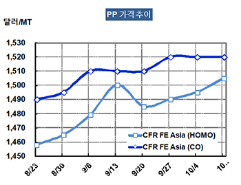PP 가격은 10월9일 CFR FE Asia 톤당 1505달러로 10달러 올랐다.