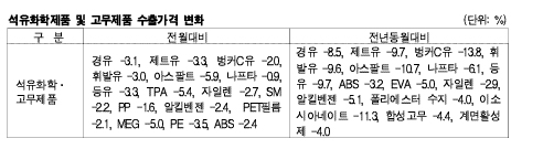 표, 그래프: < 석유화학제품 및 고무제품 수출가격 변화 > <화학저널 2013/10/17> |