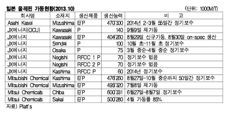 표, 그래프: <일본 올레핀 가동현황(2013.10) > <화학저널 2013/10/18> |