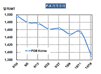 P-X 가격은 10월21일 FOB Korea 톤당 1393달러로 61달러 급락했다.