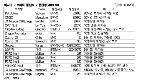 표, 그래프: < 아시아 아로마틱 플랜트 가동현황(2013.10) > <화학저널 2013/10/24> |
