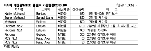 표, 그래프: < 아시아 메탄올/MTBE 플랜트 가동현황(2013.10) > <화학저널 2013/10/25> |