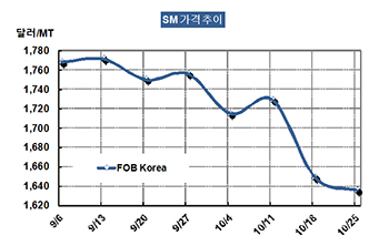 SM 가격은 10월25일 FOB Korea 톤당 1636달러로 13달러 하락했다.