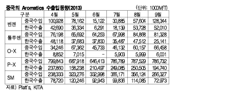 중국의 9월 아로마틱(Aromatic) 수입은 벤젠이 2배 가량 폭증했다.
