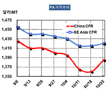 PA 가격은 10월24일 CFR China 톤당 1385달러로 25달러 상승했다.