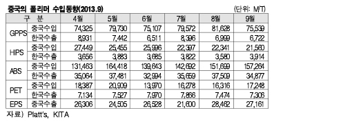 표, 그래프: < 중국의 폴리머 수입동향(2013.9) > <화학저널 2013/10/31> |