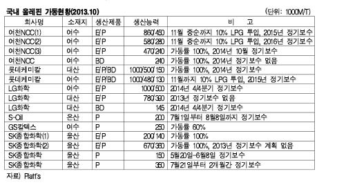 표, 그래프: < 국내 올레핀 가동현황(2013.10) > <화학저널 2013/11/01> |