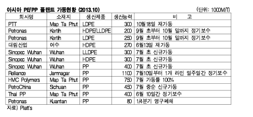 아시아 PP(Polypropylene) 시장은 7월부터 플랜트의 신규가동 및 풀가동 체제가 이어지고 있음에도 불구하고 원료코스트 강세와 재고 부족으로 수급이 타이트한 것으로 나타나고 있다. 표, 그래프: < 아시아 PE/PP 플랜트 가동현황 (2013.10) > <화학저널 2013/11/04> |