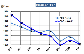 벤젠 가격은 11월1일 FOB Korea 톤당 1227달러로 28달러 하락했다.