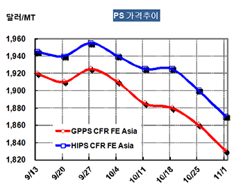 GPPS 가격은 10월30일 CFR China 톤당 1830달러로 30달러 폭락했다.