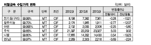 표, 그래프: < 비철금속 수입가격 변화 > <화학저널 2013/11/06> |