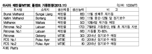 표, 그래프: < 아시아 메탄올/MTBE 플랜트 가동현황(2013.11) > <화학저널 2013/11/15> |