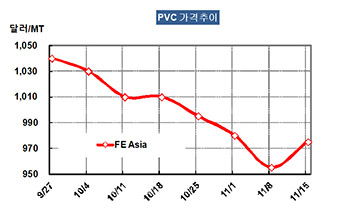 PVC 가격은 11월13일 CFR China 톤당 975달러로 20달러 상승했다.