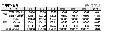 11월19일 국제유가는 미국의 원유재고 증가 전망과 세계 경제성장률 전망치가 하향 조정된 영향으로 하락했다.