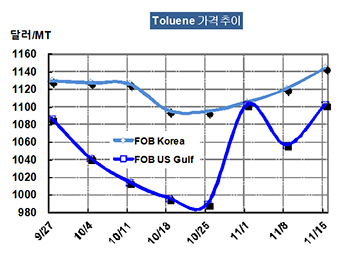 톨루엔 가격은 11월15일 FOB Korea 톤당 1145달러로 24달러 상승했다.