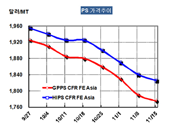 GPPS 가격은 11월13일 CFR China 톤당 1775달러로 15달러 하락했다.