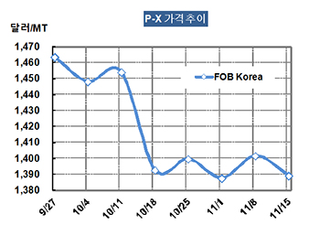 P-X 가격은 11월15일 FOB Korea 톤당 1390달러로 12달러 하락했다.