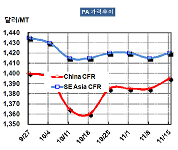 PA 가격은 11월14일 CFR China 톤당 1395달러로 10달러 상승했다.