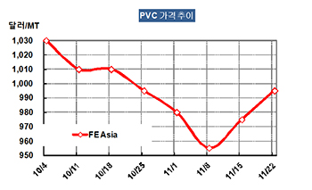 PVC 가격은 11월20일 CFR FE Asia 톤당 995달러로 20달러 급등했다.