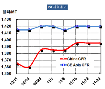 11월21일 PA 가격은 CFR China 톤당 1395달러로 변동이 없었다.
