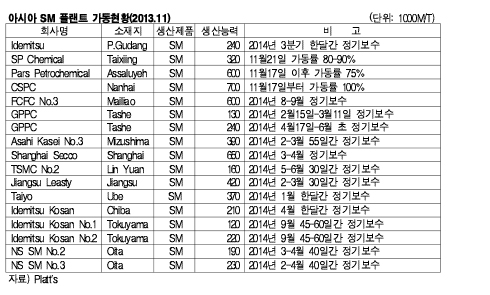 표, 그래프: < 아시아 SM 플랜트 가동현황(2013.11) > <화학저널 2013/11/28> |