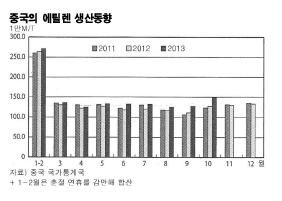 중국 국가통계국에 따르면, 2013년 10월 광공업 생산량은 부가가치 베이스 전년동월대비 10.3% 증가해 8월 이후 3개월 연속 10%를 초과했으며, 통계대상 41개 업종 가운데 40개가 플러스 성장한 것으로 나타났다. 화학원료 및 화학제품 제조업 생산량은 9월보다 0.3%포인트 상승한 12.5% 증가했다. 주요제품 생산도 안정적으로 확대되고 있다. 에틸렌(Ethylene) 생산량은 149만톤으로 16.9% 급증해 최초로 140만톤을 돌파했다. 수요가 안정세를 유지하고 있는 가운데 Daqing Petrochemical, Fushun Petrochemical 등이 증설했기 때문이다. ![]() 가성소다(Caustic Soda) 생산량은 249만톤으로 7.0%, 황산은 675만톤으로 9.8%, 합성섬유는 365만톤으로 10.5%, 원유 가공량은 4108만톤으로 3.1% 증가했다. 중국은 2013년 들어 경제성장이 계속 둔화됐으나 3/4분기 GDP(국내총생산) 성장률이 7.8%를 기록해 2012년 4/4분기 이후 3분기 만에 상승세를 나타냈다. 1/4-3/4분기 총 GDP 성장률은 7.7%로 2013년 정부 목표인 7.5%를 상회하고 있다. 중국 경제는 2013년 말 이후 회복될 것이라는 의견이 주류를 이루었으나 중반부터 서서히 회복세로 전환되고 있는 것으로 나타났다. 약세를 지속했던 화학제품 가격도 8월 이후 상승조짐을 보이고 있다. 중국 자동차공업협회에 따르면, 1-9월 자동차 생산량은 약 1594만대로 12.8% 증가했고 상반기에 높은 수준을 나타냈던 유통재고도 대부분 해소됨에 따라 2013년 총 생산량이 2000만대를 돌파할 가능성이 높아지고 있다. 공업정보화부에 따르면, 1-8월 가전 생산량은 냉장고가 약 6470만대로 11.1%, 에어컨이 약 1억100만대로 9.0%, 세탁기가 약 4490만대로 7.7% 증가한 등 다운스트림 분야가 성장세를 계속하고 있는 것으로 나타났다. 표, 그래프: < 중국의 에틸렌 생산동향 > <화학저널 2013/11/29> |